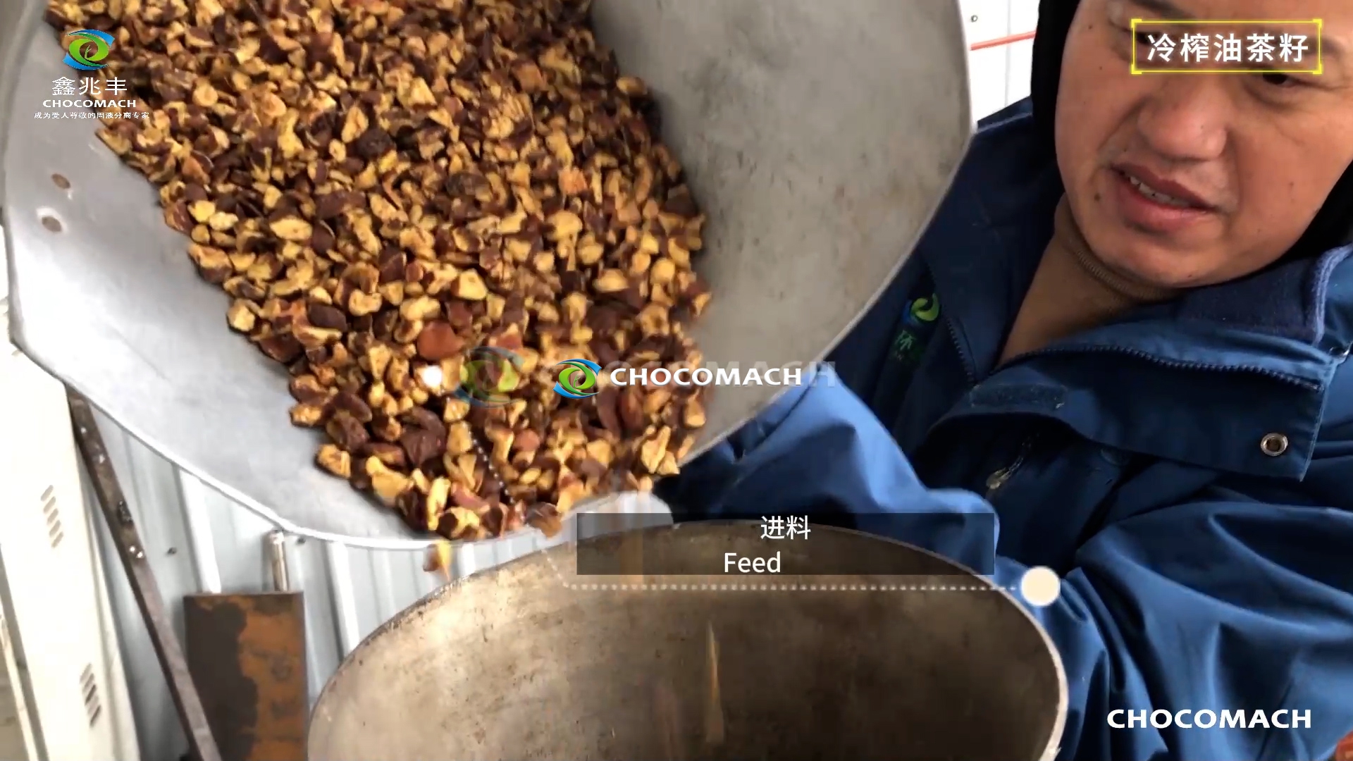 鑫兆豐YZW-2全自動(dòng)茶籽仁直接冷榨現(xiàn)場(chǎng)--油茶籽仁投料↑