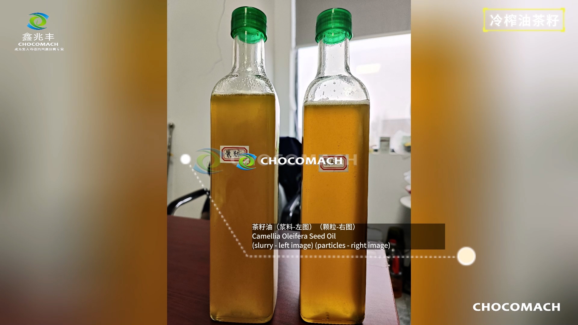 鑫兆豐YZW-2全自動(dòng)茶籽仁直接冷榨現(xiàn)場(chǎng)--茶籽油(漿料壓榨的茶籽油,左瓶) (顆粒壓榨的茶籽油,右瓶)↑
